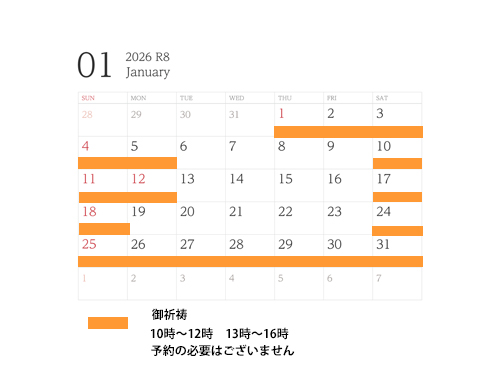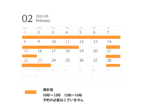 下記カレンダーでオレンジ色が御祈祷可能日です。